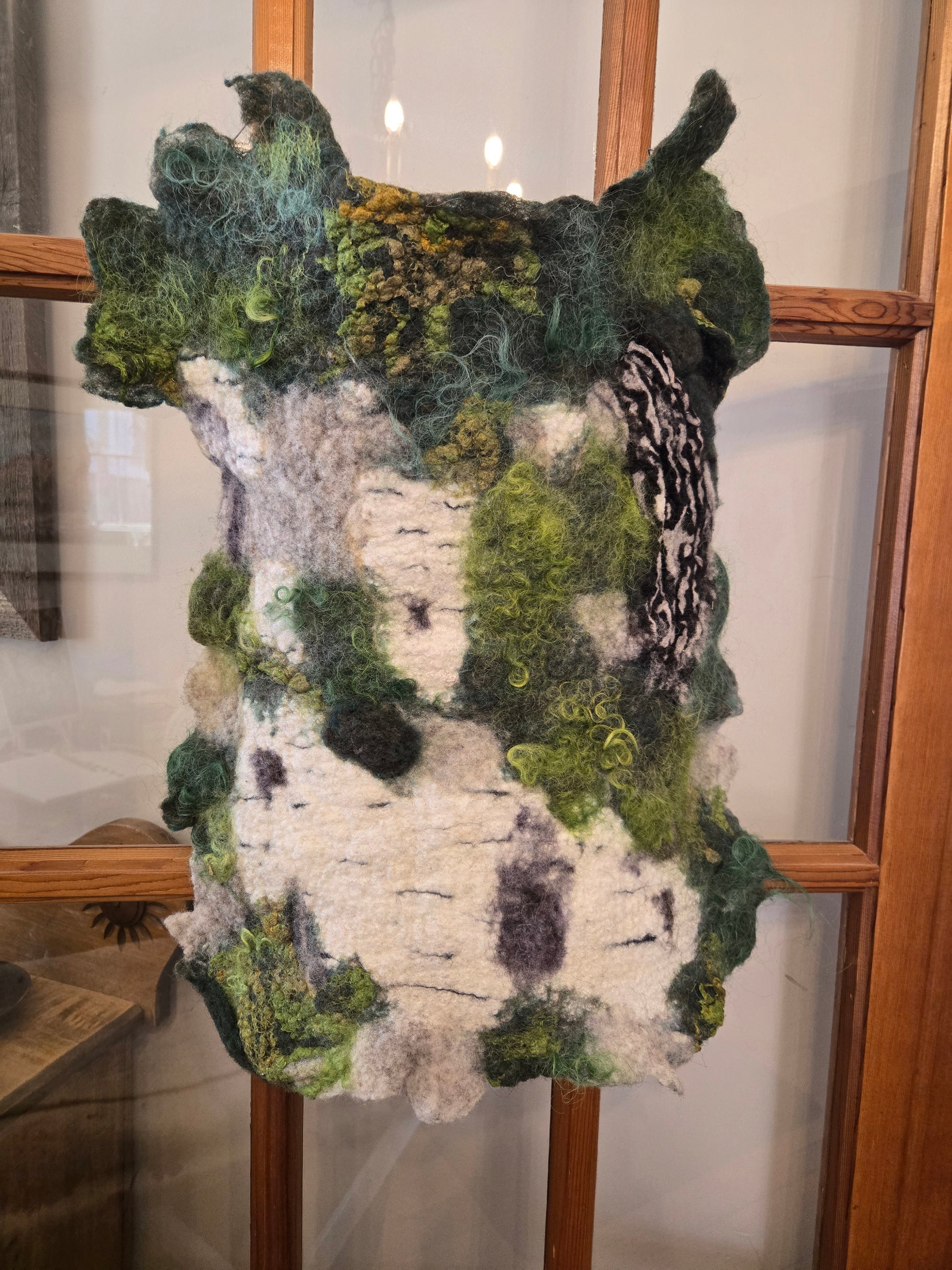 Beneath Still Boughs is a tactile exploration of forest textures rendered in wool. Measuring 16 by 19 inches, this three-dimensional piece captures the essence of a birch tree trunk, with its distinctive white and gray bark accented by black markings. Surrounding the central trunk are lush patches of green and yellow-green felt that evoke moss and lichen, bringing a realistic sense of natural growth to the composition. The irregular, organic shape of the artwork enhances its connection to the woodland environment, inviting viewers to engage not only visually but almost physically, as if reaching out to touch the cool, damp bark and soft moss found deep in the woods. Through its rich textures and earthy hues, this piece gently transports you into a quiet moment beneath a tree’s canopy, where the interplay of light and life can be felt in every fiber.