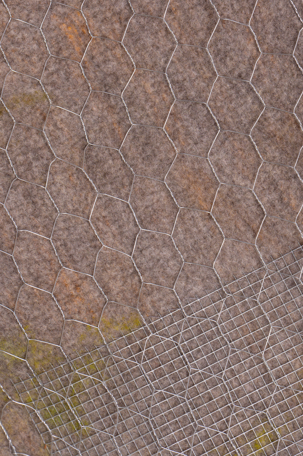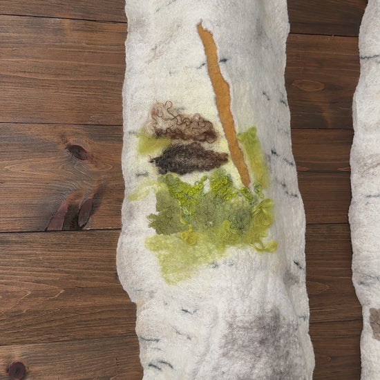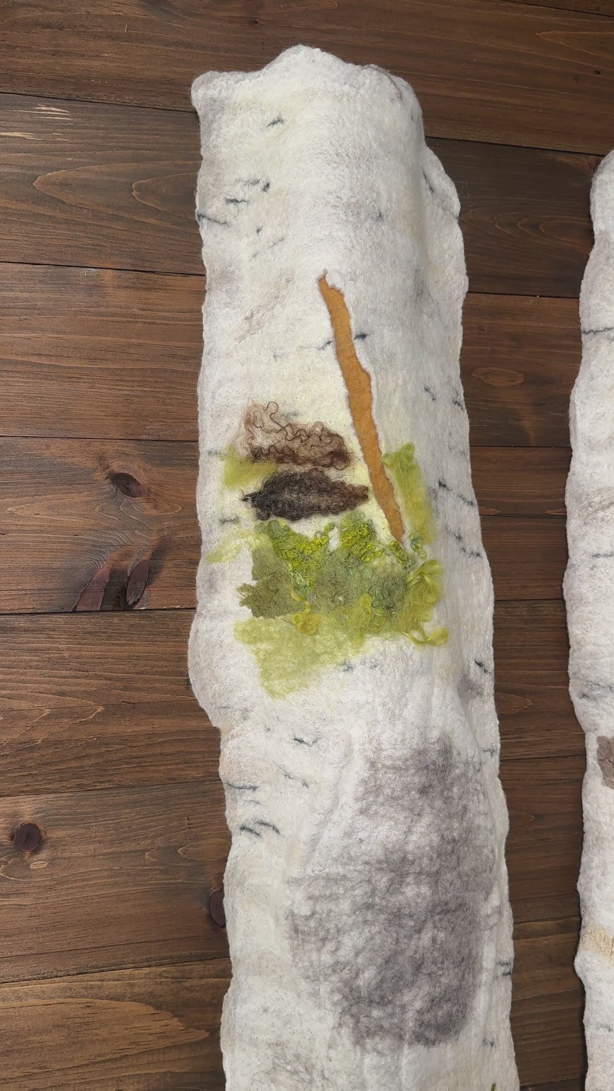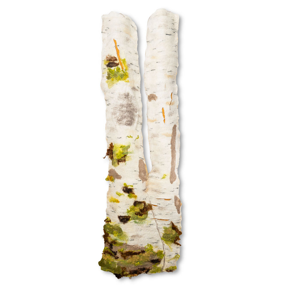 Between Moss and Memory presents two vertical, sculptural forms that evoke the slender trunks of birch trees. Standing 63 inches tall and 28 inches wide, these pieces lean against the wall, their cylindrical shapes inviting viewers into a close, tactile experience. Layers of wool and silk create a richly textured surface, painted with naturalistic details mimicking white bark, black horizontal striations, and patches of mossy green and earthy brown tones. The interplay of color and texture captures the quiet presence of birch trees, suggesting the slow rhythms of nature and the passage of time. The work balances a strong physicality with a delicate, organic feel, encouraging reflection on memory rooted in place and natural cycles.
