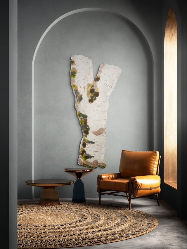 Quiet Layers of Growth is a sculptural wall piece measuring 68 by 29 by 4 inches, crafted from wool felt to evoke the natural form of a birch tree segment. Its rounded, organic shape is detailed with the distinctive white bark marked by black horizontal lines and irregular patches. Integrated darker spots and subtle textures of green moss or lichen bring depth and a lived-in quality to the surface. The artwork invites a tactile experience, emphasizing the quiet, gradual layering found in nature. Its gently floating presence, untethered from any base, enhances the sense of lightness and growth, capturing the simple beauty and rich textures of a tree’s bark in a new, dimensional way.