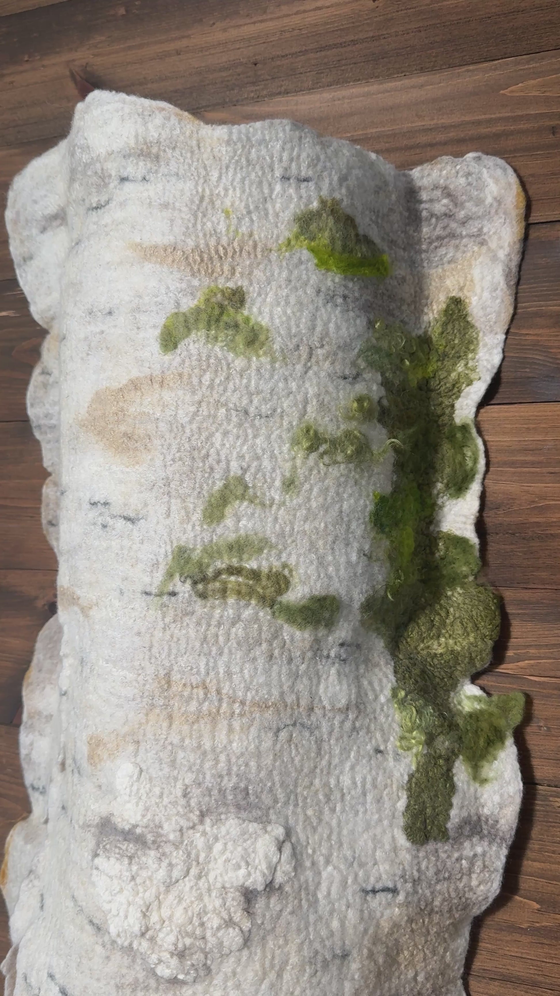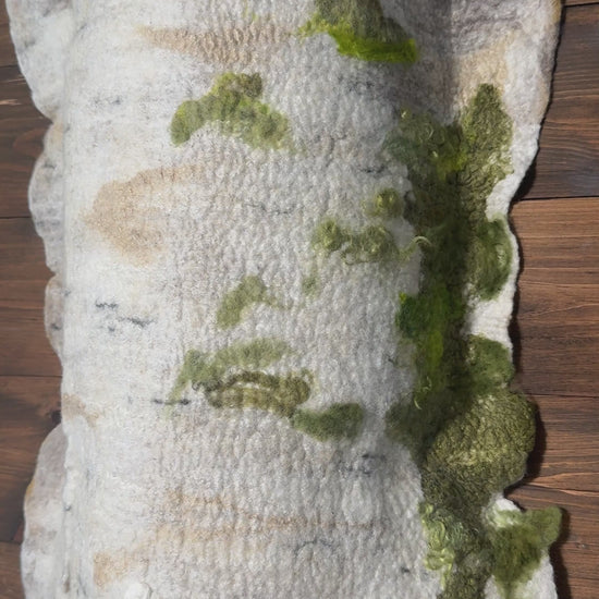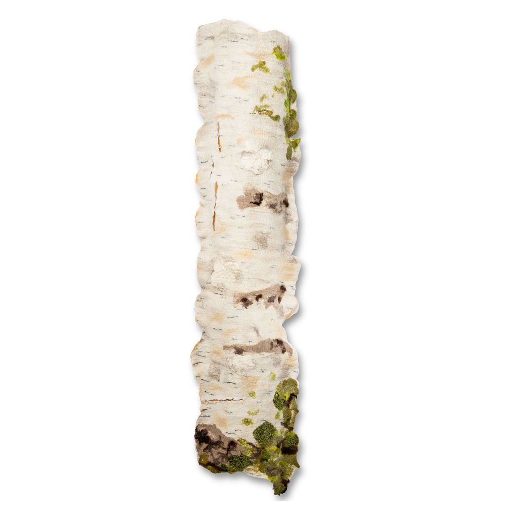 Echoes from the Temagami Trail stands 66 inches tall and 19 inches wide, presenting a vertical, sculptural form inspired by natural decay along forest paths. Crafted from layered wool and silk, the piece captures the texture of a weathered birch log, its off-white surface marked by uneven bulges, indentations, and patches of green moss. The irregular, tactile surface invites a physical closeness, evoking the quiet resilience of the wilderness and the passage of time visible in fallen wood. Its earthy palette and organic shape suggest a deep connection to the forest floor, encouraging viewers to reflect on the subtle rhythms and textures found in nature’s cycles.