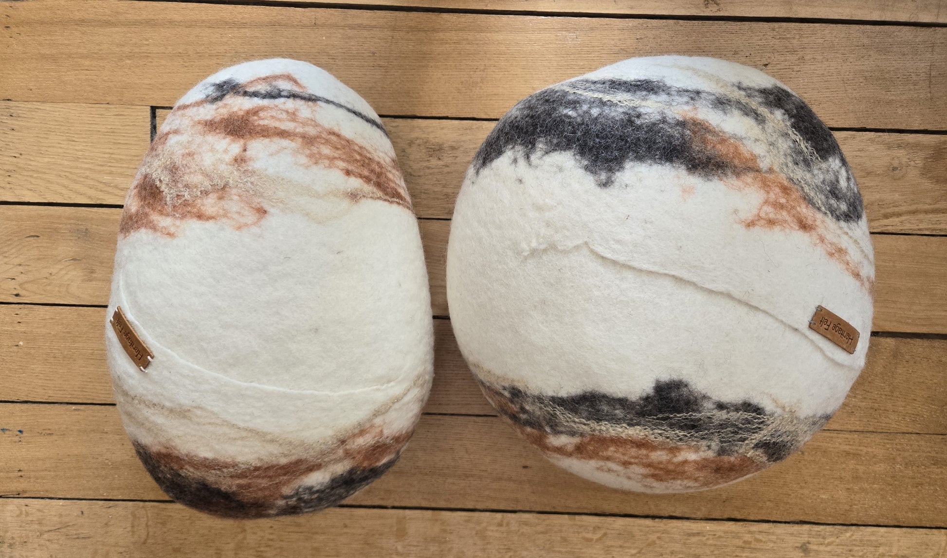 Each pillow is handmade from high-quality wool, carefully shaped with natural fibers to resemble the organic variations found in stones. Generously filled with Ontario wool, this pillow is perfect whether nestled on your sofa, perched on your favorite reading chair, sitting on the floor for your feet, or gracing your bed. It provides both a cozy spot to rest and a conversation piece that invites curiosity.