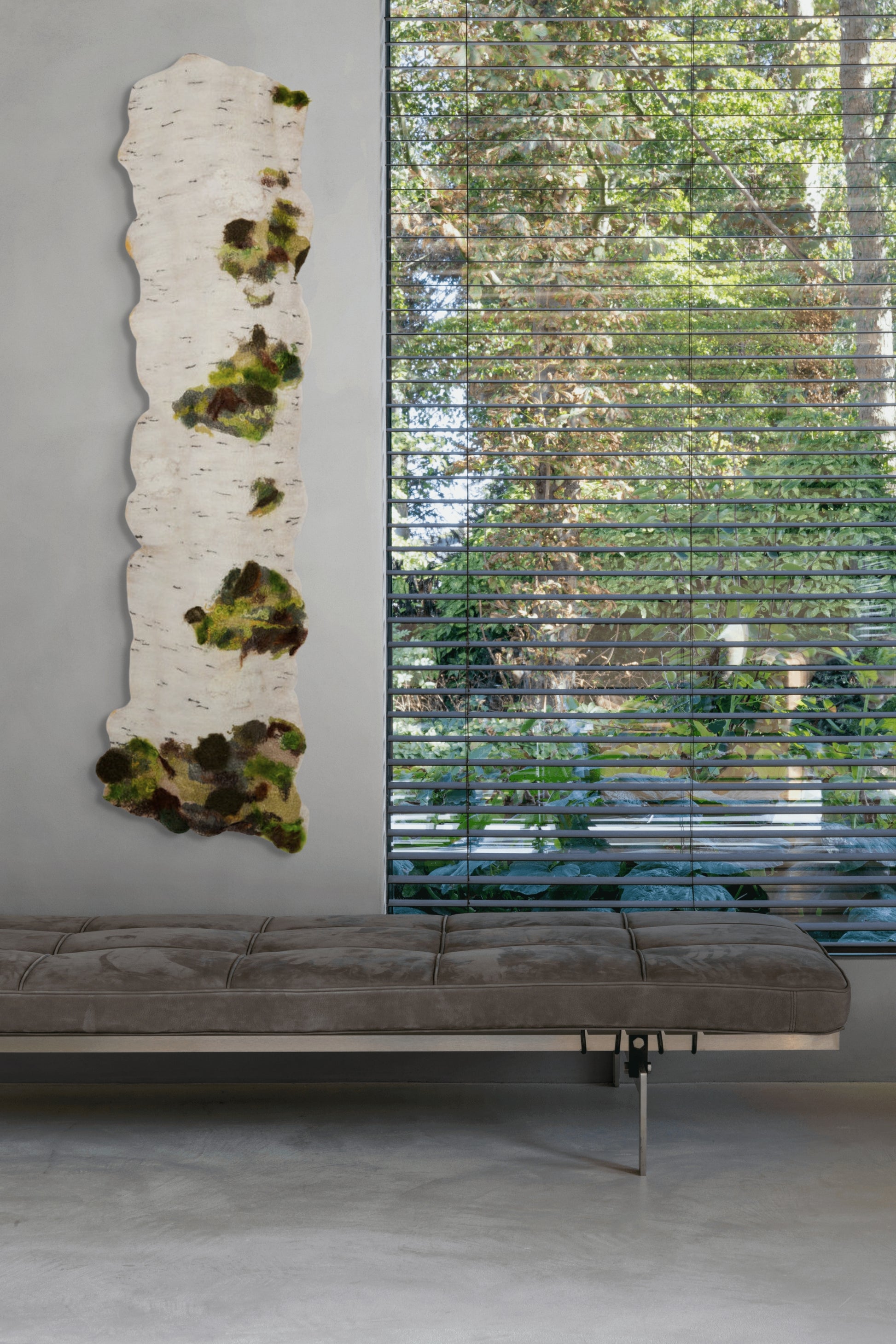 Measuring 63" x 18" x 4", this vertical wool felt sculpture captures the quiet presence of birch bark with refined simplicity. Its textured white surface shows delicate horizontal markings and subtle irregularities that suggest natural aging. Dark green and textured patches appear like moss and lichen, punctuating the composition with a sense of slow growth and quiet transformation. The slightly uneven edges enhance the organic character, inviting closer inspection of the tactile layers. Suspended as a slender strip, the work conveys stillness and the timeless rhythm of nature’s slow processes.