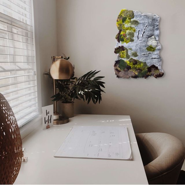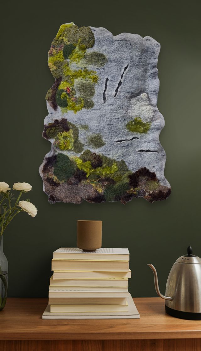 Mossbound Murmurs of Time is a felted wall piece measuring 23 by 17 by 5 inches. Its irregular shape and layered texture invite a closer look, with a base that resembles the soft, muted gray of birch bark. Patches of green, yellow, brown, and subtle red tones overlay the surface, blending dense, plush wool and silk to mimic moss and lichen growing on the bark. Narrow slits cut into the felt provide a striking contrast that breaks the softness. This work captures the quiet, tactile essence of natural decay and renewal, evoking the intimate rhythm of time as it weaves through the landscape.