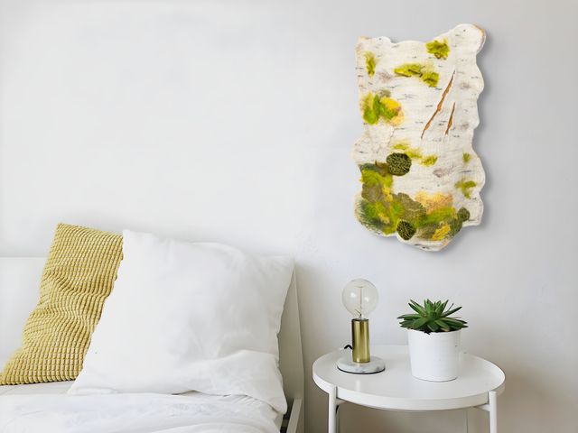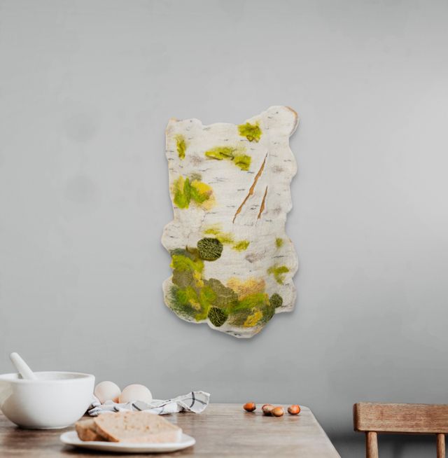 The Breath of Lichen and Light, measuring 21" x 17" x 4", is a sculptural piece that captures the quiet resilience of birch bark through a tactile blend of wool and silk. Its curved, uneven form invites close engagement, revealing textured surfaces marked by subtle cracks and crevices that suggest natural weathering. Areas of green, brown, and yellow fibers suggest moss and lichen growing delicately over time, adding layers of organic color and life. The work balances a strong sense of material presence with an intimate reflection on natural cycles, offering a quiet portrait of the layered, slow transformation found in the forest.