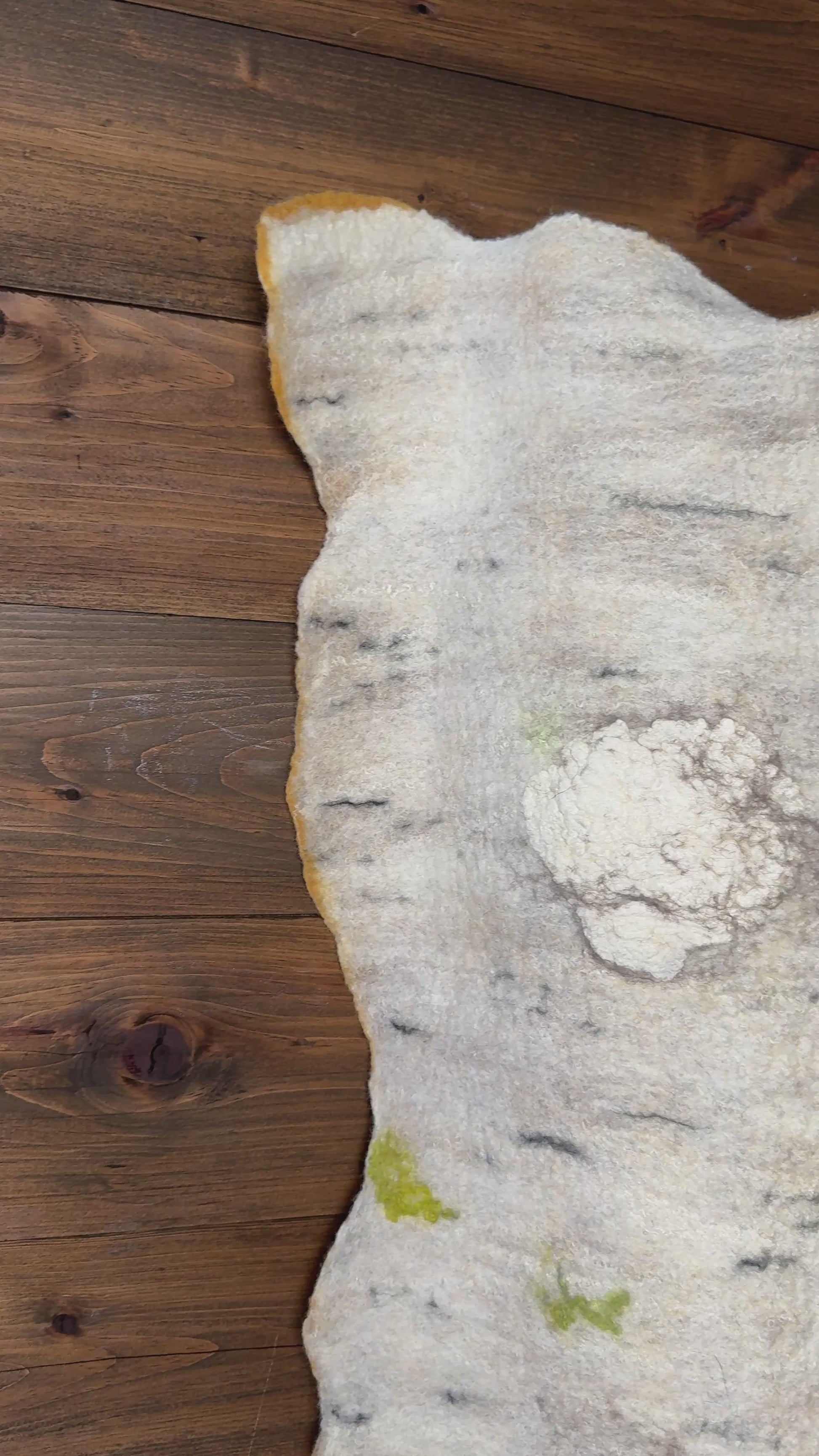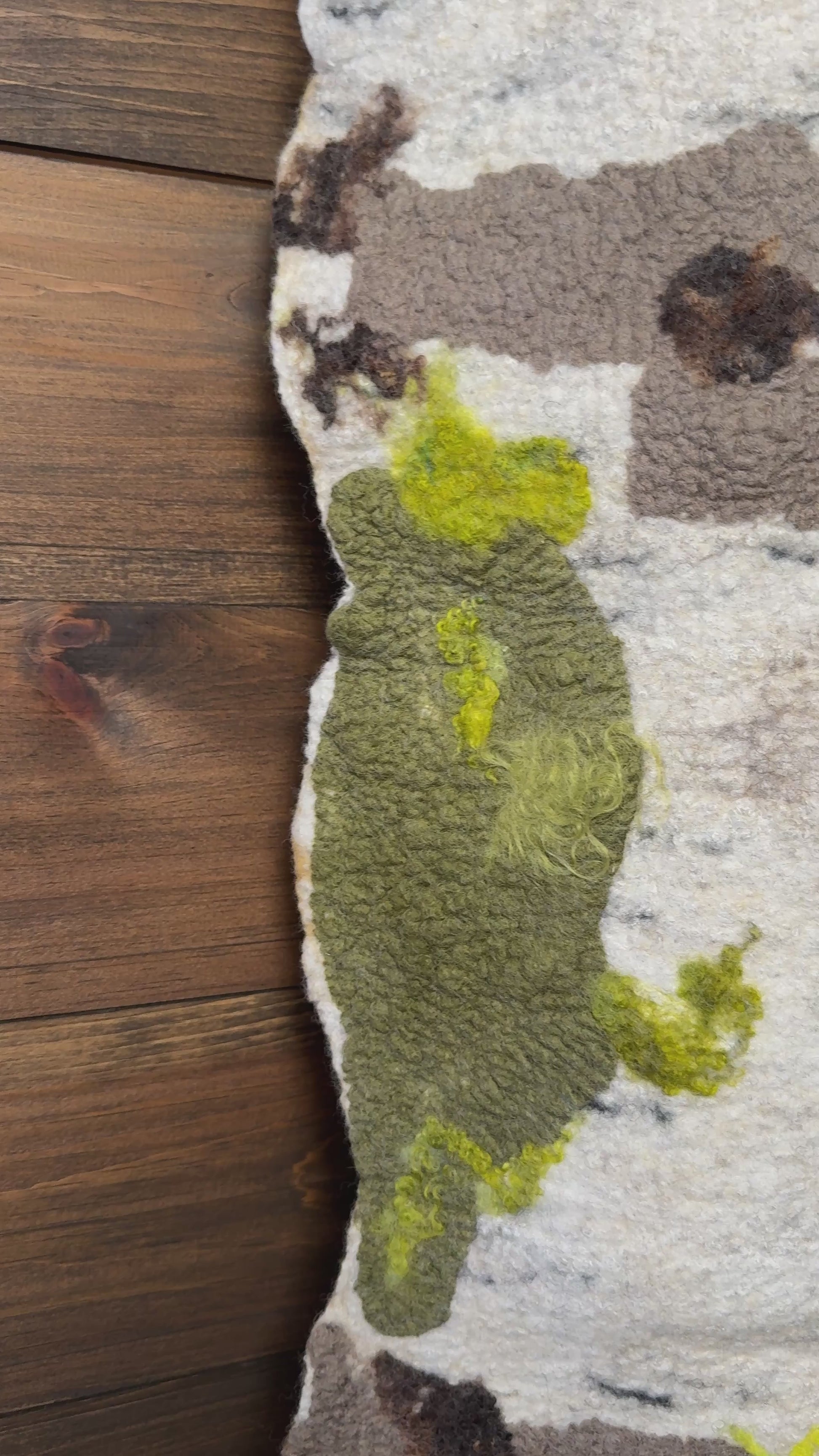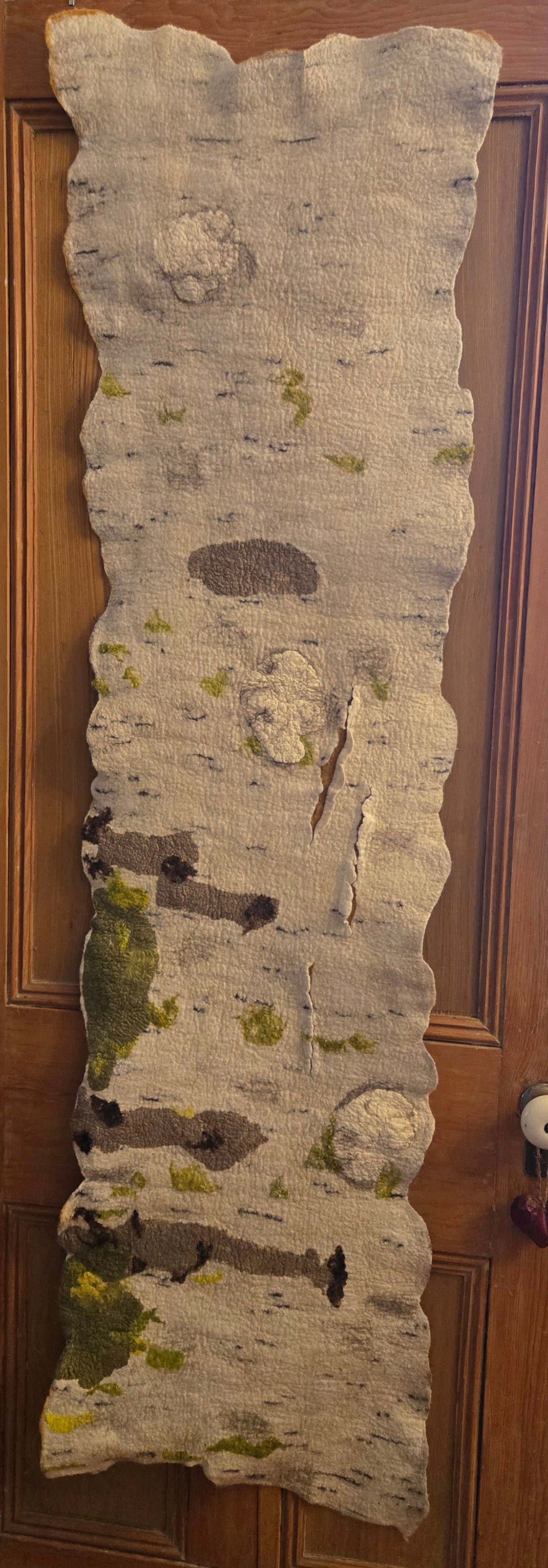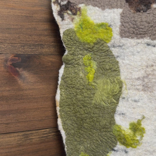 Measuring 65" by 18" by 4", this elongated textile piece invites a quiet contemplation of the forest floor’s slow transformation. Crafted from wool and silk, its surface is richly textured with raised, organic forms that echo fallen birch trees in various stages of decay. The light, neutral palette of beiges and off-whites is gently punctuated by earthy greens and deep browns, grounding the work in a subtle naturalism. Its uneven, wavy edges enhance the sense of movement and growth, as if the piece itself breathes with the cycles of the woodland. The three-dimensional layering creates a tactile depth, encouraging a closer look that reveals the delicate interplay between fabric and form—capturing the patient, rhythmic return of nature to earth.